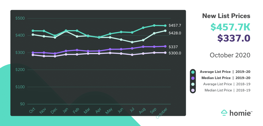 At $457.7K, October saw a +6.9% year-over-year increase in average list price. Median prices also rose. With a +12.3% increase from October 2019, the median list price in October was $337K.