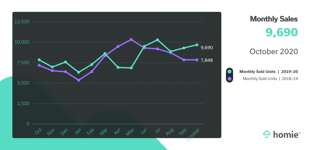 According to data from the ARMLS® from October 1, 2020 to October 31, 2020, monthly sales in the Phoenix metro area rose +4.1% from where they were in September of this year. At 9,690, total monthly sales are a full +23.5% higher than sales during the same time period in 2019.