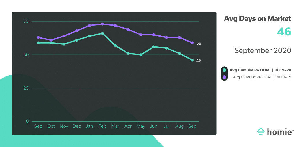 The Average Cumulative Days on Market continues to drop. Homes are selling faster and faster every month. The average DOM for September 2020 was 46, which is a 5-day decrease from August 2020 and a 13-day decrease from September 2019.