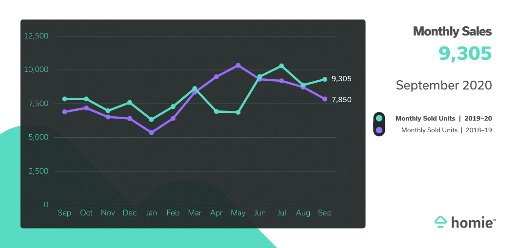 According to data from the ARMLS® from September 1, 2020 to September 30, 2020 the Phoenix metro area saw 9,305 total sales in the month of September. This is a +4.8% from the previous month. Looking at the year-over-year comparison, the jump is even higher. September 2020’s monthly sales are +18.5% higher than monthly sales in September 2019.