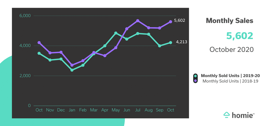 According to data from the Utah MLS from October 1, 2020 to October 31, 2020 monthly sales in Utah are rising. At 5,602, there were 417 more monthly sales in October of this year than in September. This is a +15.4% increase from October 2019.