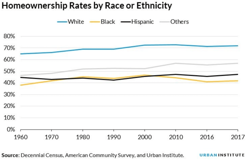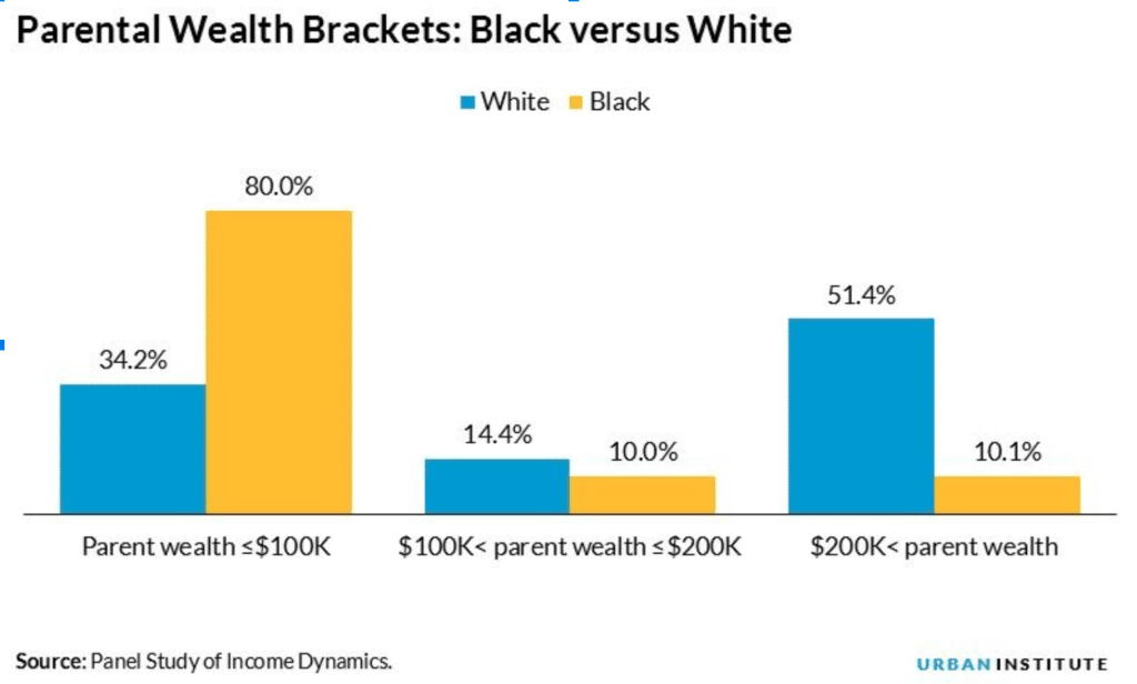 The Urban Institute’s research found that young adults whose parents had incomes greater than $200K were significantly more likely to own homes than young adults whose parents had incomes lower than $100K. This causes a huge racial gap because the study showed 51% of white parents have over $200K, while just 10 % of black parents have an income in that range.
